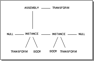 In the simple assembly example, an assembly contains a pointer to an instance and a transform. The transform allows the assembly to be moved cheaply with bodies. Each instance is made up of a pointer to a body and a transform. Instances are connected in a