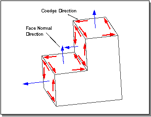 Coedges in a loop are oriented so that looking along the coedge with the outward pointing face normal upwards, the face is on the left. In Figure 6-14, the directions of the face normals (blue arrows) and coedges (red arrows) for several faces of a body are shown to illustrate this orientation.