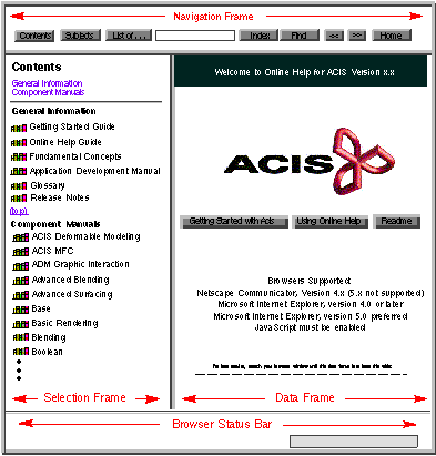 ACIS.HTM into your browser. The online help screen is divided into three frames--navigation, selection, and data--as illustrated in Figure 1-1. Refer to Chapter 2,