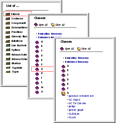 . button displays the links to all of the available reference material by its type, such as classes, functions, Scheme extensions, etc.