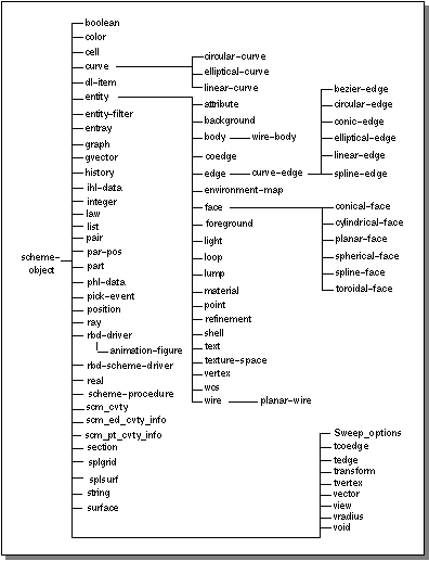 ACIS Scheme extensions, in addition to those that are native to Scheme. These data types are described in online help. Some data types are specific to