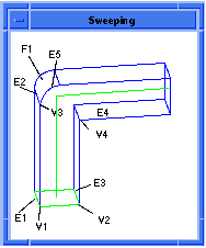 Although E2 and E4 are resulting from E1 and E3, there are no annotations on E2 and E4. Similarly there are no annotations on V3 and V4. Edges and vertices such as these that are a result of the sweep operation proceeding through a miter are not annotated.